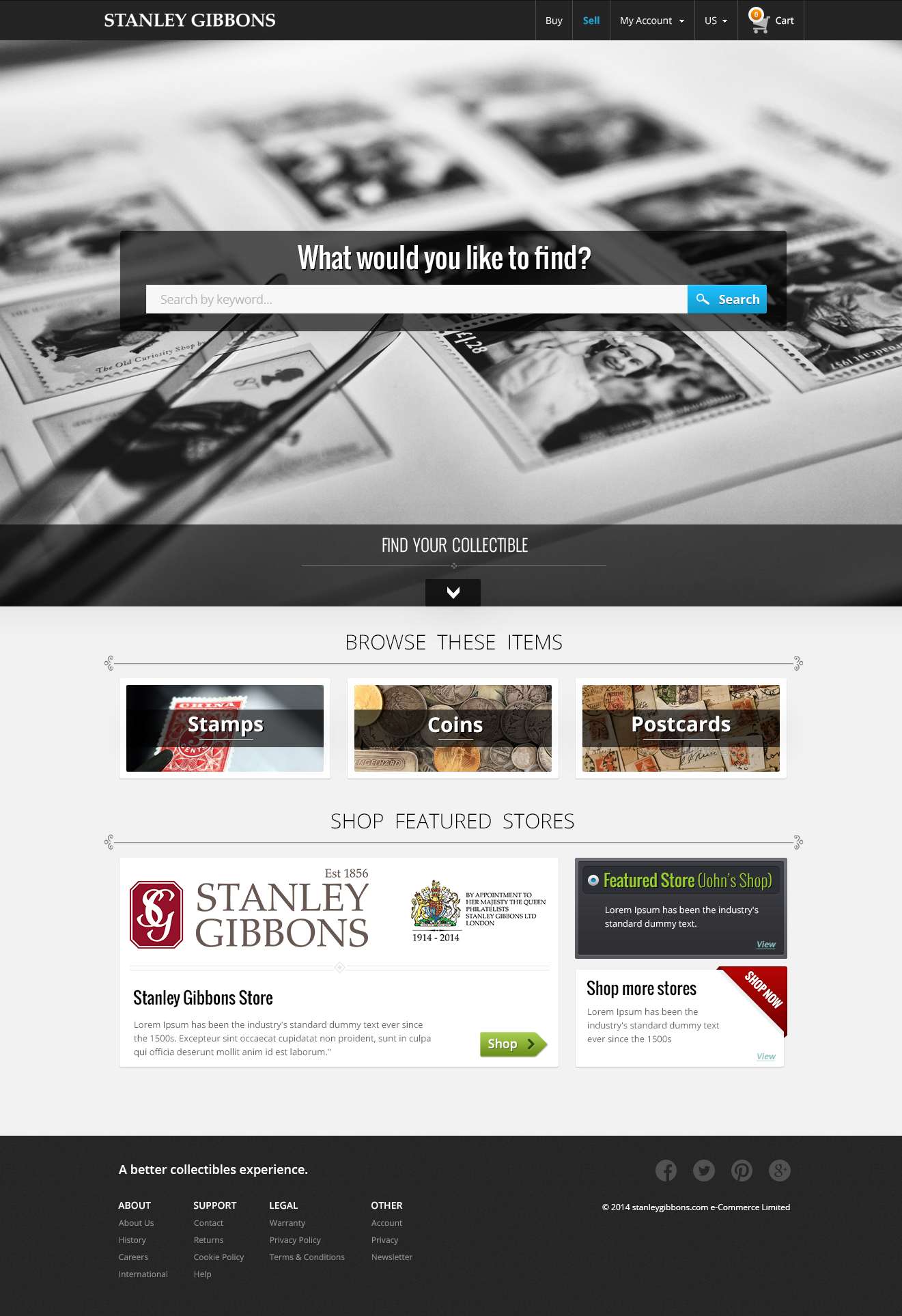 Visual Design, Wireframing, Tablet InteractionsVersion 1.0 of the NEW Stanley Gibbons Maketplace Landing Page Design.