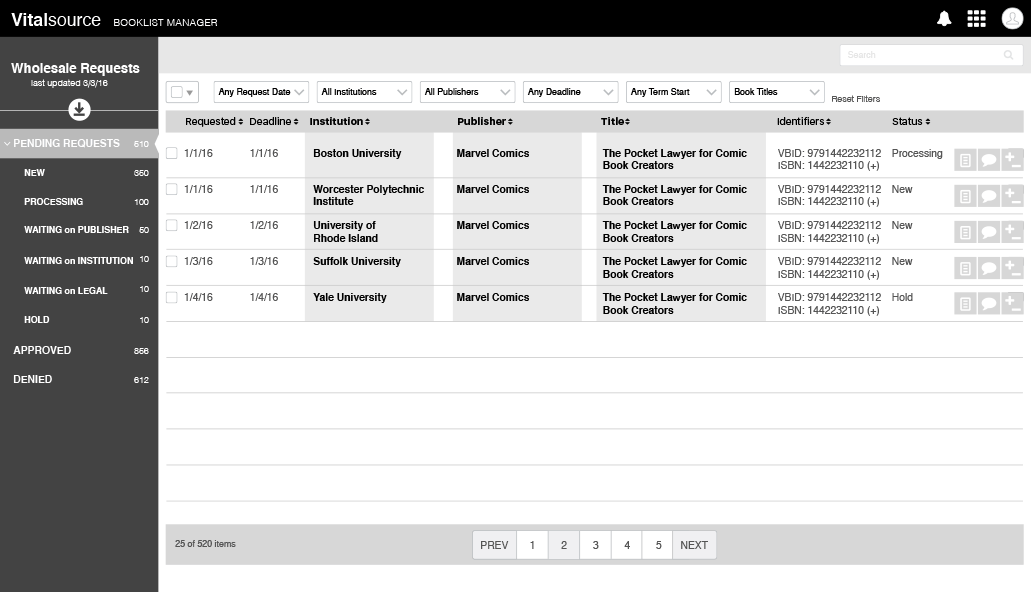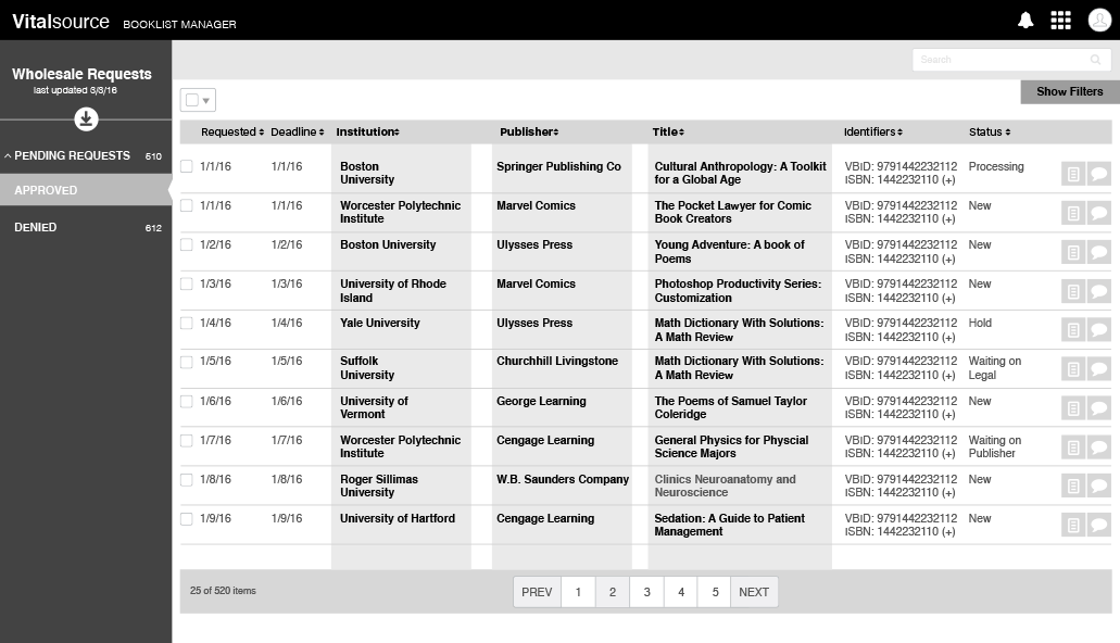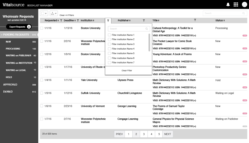 backRelated work for enhancing VitalSource's Booklsit Manager project to provide internal VST users a way to filter their Booklist which they manager in the table view you see here. I've placed a few options on this page we which we are testing with our Account Managers internally.
