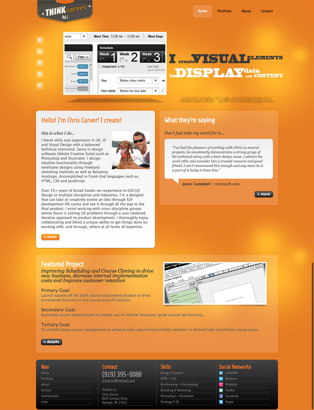 This was the first version of thinkCarver.com with the hopes of many more to come. It's my little virtual playground to kick around ideas and release some of those creativet juices from the daily 9 - 5 grind we call "wrok". Go visit, click around and see what you think!