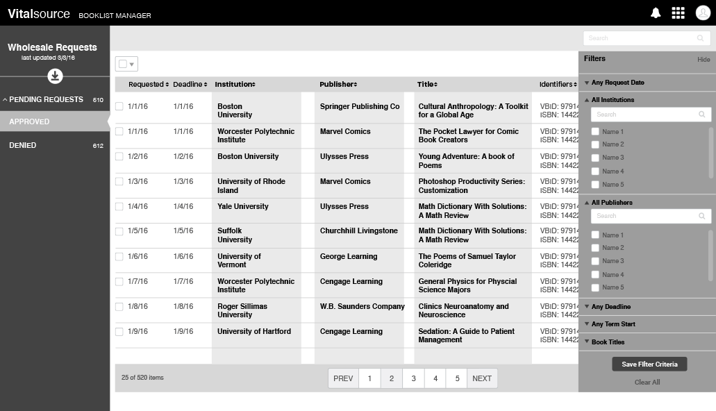 backRelated work for enhancing VitalSource's Booklsit Manager project to provide internal VST users a way to filter their Booklist which they manager in the table view you see here. I've placed a few options on this page we which we are testing with our Account Managers internally.